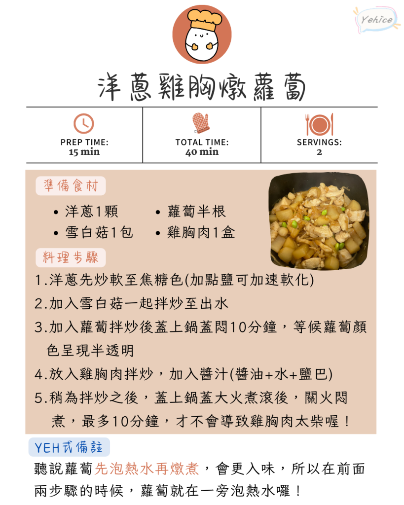 填飽肚子 【快煮鍋】洋蔥雞胸燉蘿蔔 by Yeh 2025 年 3 月 5 日 作者 Yeh 2025 年 3 月 5 日 0 留言 489 瀏覽次數 調整字型 重置 489 內容大綱 食材&步驟食譜 以前都以為煮蘿蔔很費時,要燉很久才會透,也很怕會苦!但其實只要多削掉一些纖維就沒有這些問題了。試過一次後,根本是餐桌常客,也十分有飽足感!這道菜非常適合鋪在白飯上,是一道健康無負擔的丼飯料理。步驟圖跟食譜都在下方啦! 食材&步驟 1.備上喜歡的蔬菜及肉品 2.洋蔥先炒軟至焦糖色,加入雪白菇拌炒 3.蘿蔔拌炒後蓋上鍋蓋悶10分鐘,等候蘿蔔顏色呈現半透明 4.放入雞胸肉拌炒,加入醬汁 5.關火悶煮,最多10分鐘 食譜 快煮鍋雞肉料理 分享 0 FacebookTwitterPinterest Yeh 如果你也喜歡我的分享,可以透過下面方式聯絡我 上一篇文章 【新家準備】從條列需求開始應對客變 下一篇文章 從不常看書,到現在可以大聲說「我喜歡」 留下您想說的 取消回覆 儲存我的名字、Email和網站於瀏覽器中,方便我下次使用。