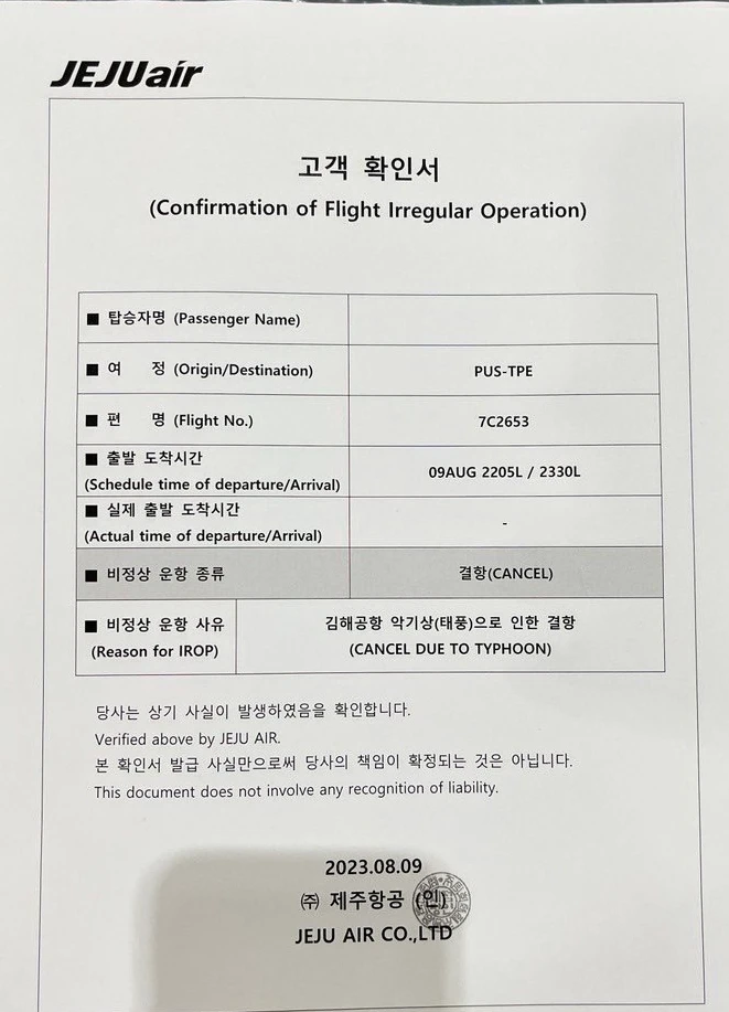 2.取消證明:航班取消或延誤都是可以向航空公司申請證明的,我們是直接在機場向濟州航空的服務櫃檯申請取消證明。