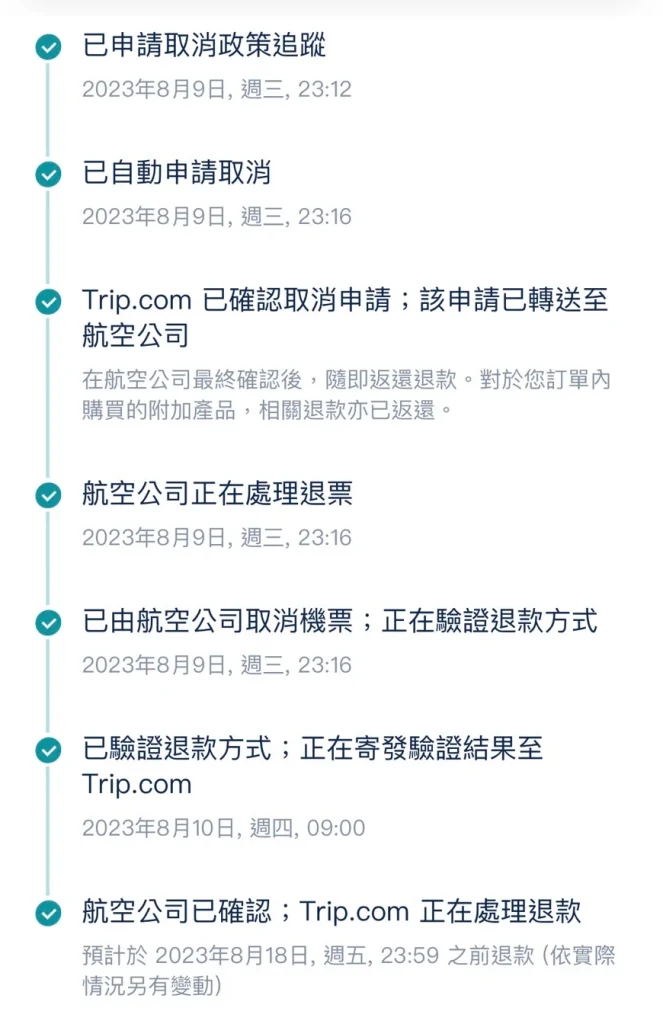 回台後,馬上先處理機票退費的問題。向Trip.com客服提出退費的申請,客服的回應速度相當快速,且退款申請的進度都有寄Email通知。很幸運地,我們後來有拿到單程的全額退費,接著就開始準備理賠申請的資料。